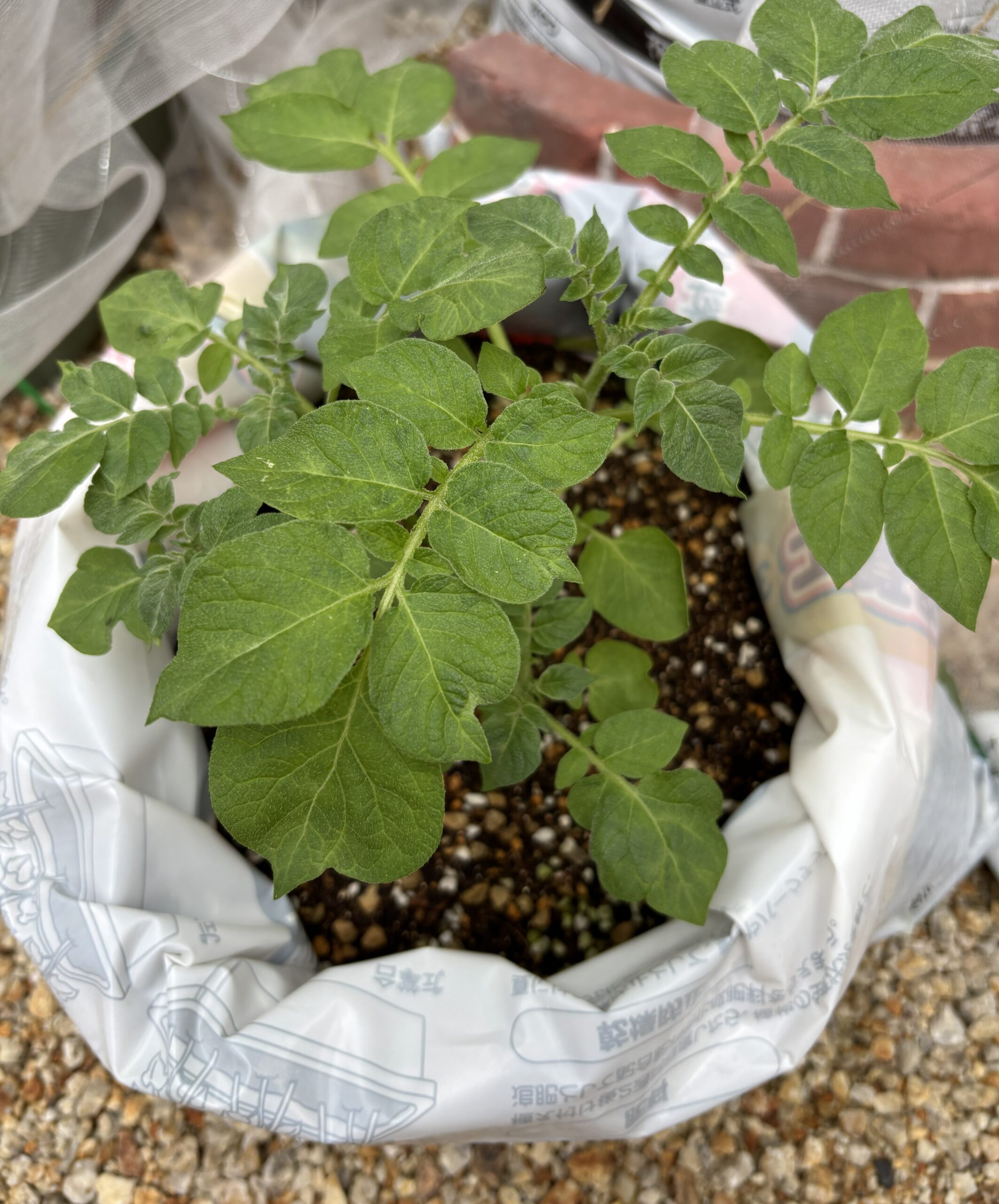ジャガイモは25リットルの野菜の土が入っていた袋に土を入れて育てています。
