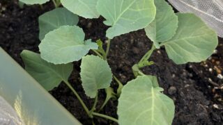 モロッコインゲンの株元で育苗していたブロッコリー苗3本を、新しいプランターに定植しました。徒長気味の苗を深植えして、防虫ネットで害虫対策も。
